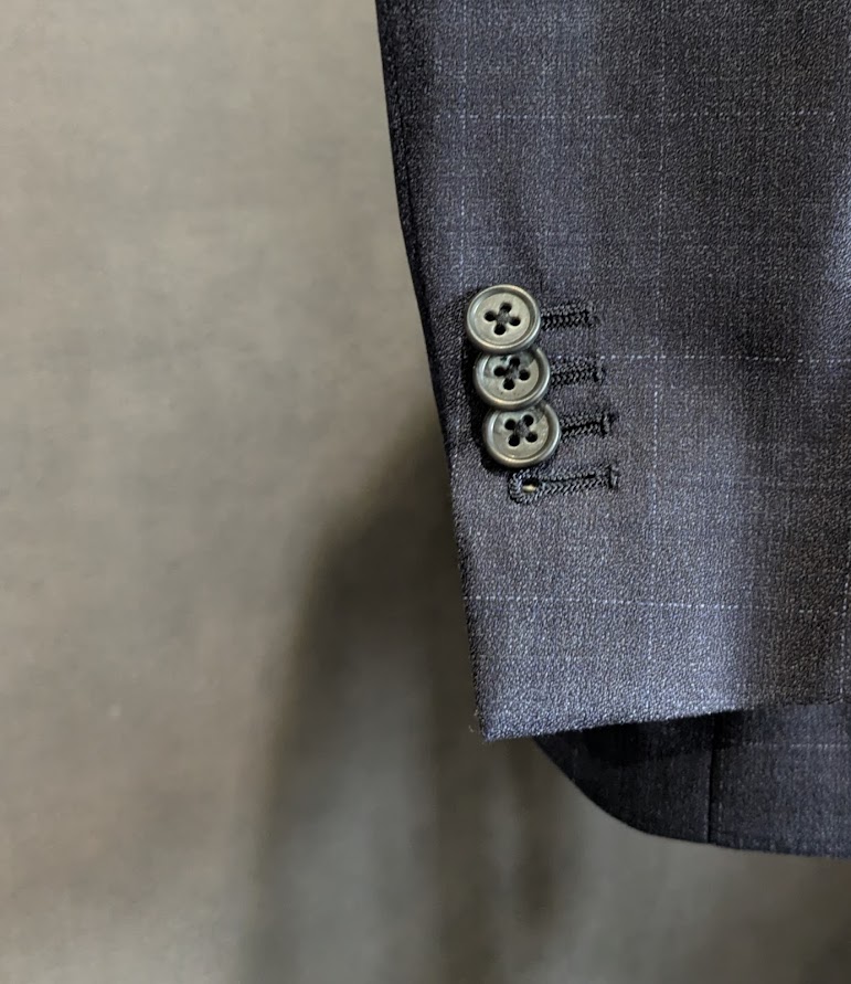 その1つが袖口のボタンが外せる(単なる飾りではない)「本切羽」仕様。袖口ボタンというのは元々なかったもので、ナポレオン・ボナパルトが付けたと言われます。その後、19世紀初頭に「診察しやすいように腕まくりをしたい」とイギリス人医師が要望したことから、本切羽が生まれたという説があります。