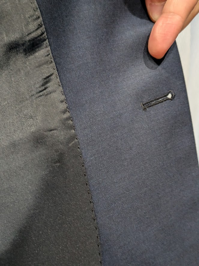 皆さんがお手持ちのスーツの裏地の縫い付けも確認していただきたいのですが、下の上図のように縫い目がない状態で裏地が取り付けられていると‟高度な縫製”ということができます。(下図のように裏地に縫い目が出ている状態ですと‟縫製が甘い”ということになりますが)スーツの裏地付けは、仕立ての良し悪しが最も表れる工程のひとつ。表地を糸1本だけすくう繊細な縫いで表に縫い目を出さずに仕上げ、上図のような均一で美しい“すくい縫い”は、軽さ・動きやすさ・耐久性を生む大切な技術です。