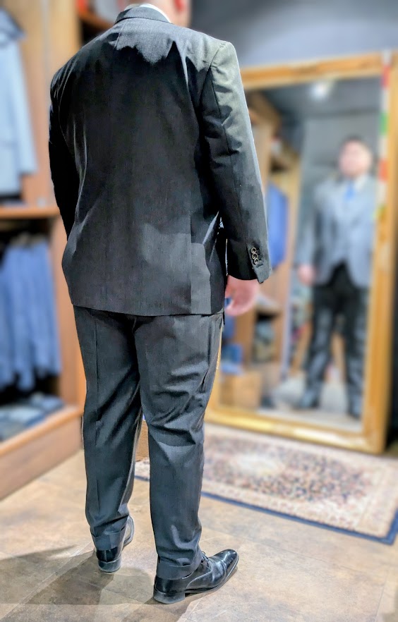 S様は肩幅が広く太腿が太い、恰幅の良い体型の持ち主でいらっしゃいます。ですから、上衣のサイズを肩幅に合わせる・トラウザーズのサイズをウエストに合わせる等、既製服で特定の部位にサイズを合わせてしまうと、他の部位が大き過ぎたりキツかったりと支障が出てしまいます。そんな方には(特に)オーダーメイドがオススメなのですが、下の画像の通りそれぞれの部位がジャストサイズで収まり、「美しいシルエット」が完成していることがお分かりいただけるかと存じます。
