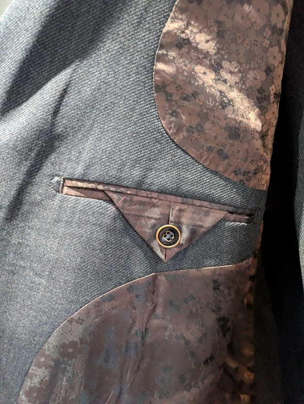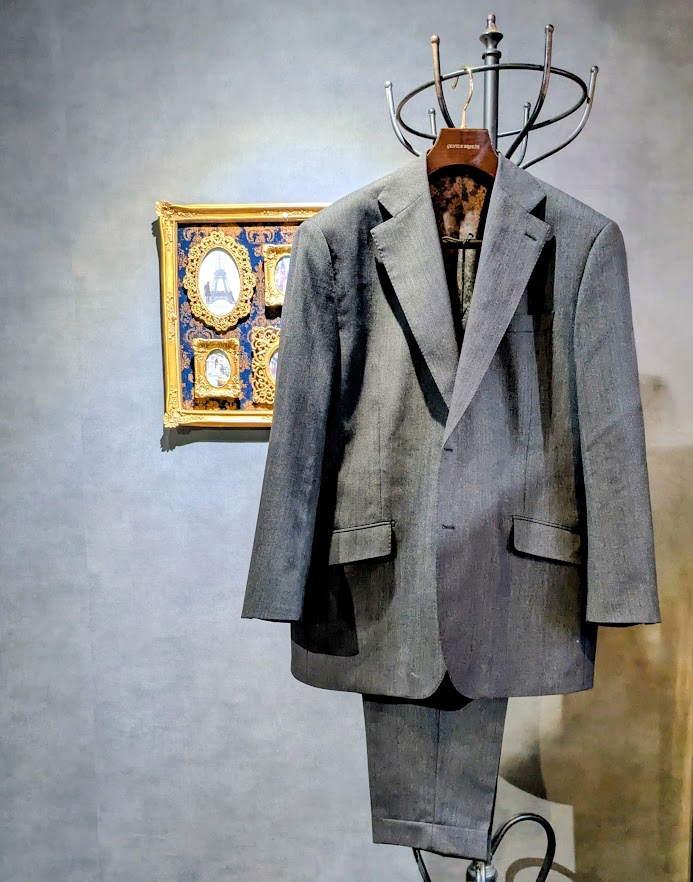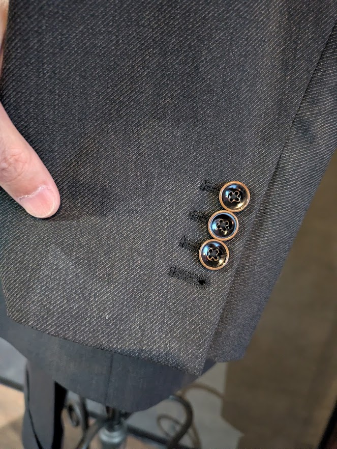 その一つが「焼き本水牛」のボタン・・・オーダースーツにおいて水牛ボタンというのは最上級の素材となるわけですが、‟焼き”を加えることで独特の質感と高級感が醸成され、スーツにワンランク上のラグジュアリー感を与えてくれるもの。スーツ全体に占める表面積が小さいボタンですが、それをもお座なりにしないS様の審美眼の深さを感じることができます。