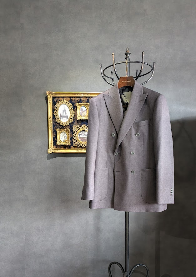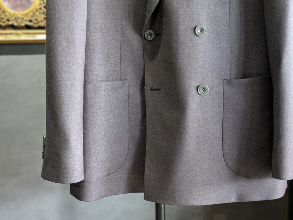 ダブルブレストは軍人の防風対策として前身頃の生地が重なるように仕立てられ、本来構築的で「威厳」を兼ね備えたフォーマルな存在。そんなダブルブレストジャケットにE様はアウトポケットを設えられました。アウトポケットが付くことで実用性と軽快さが加わりますが、それでもまだ威厳は残るもの。だからこそ着こなしでは“削ぐ”意識が重要であり、肩はナチュラル(肩パットなし)・芯は薄め・着丈はやや短めとしました。胸を張り過ぎず・どこか力の抜けた佇まいは「余裕」を足すことを意識したディテール・・・秀逸です。